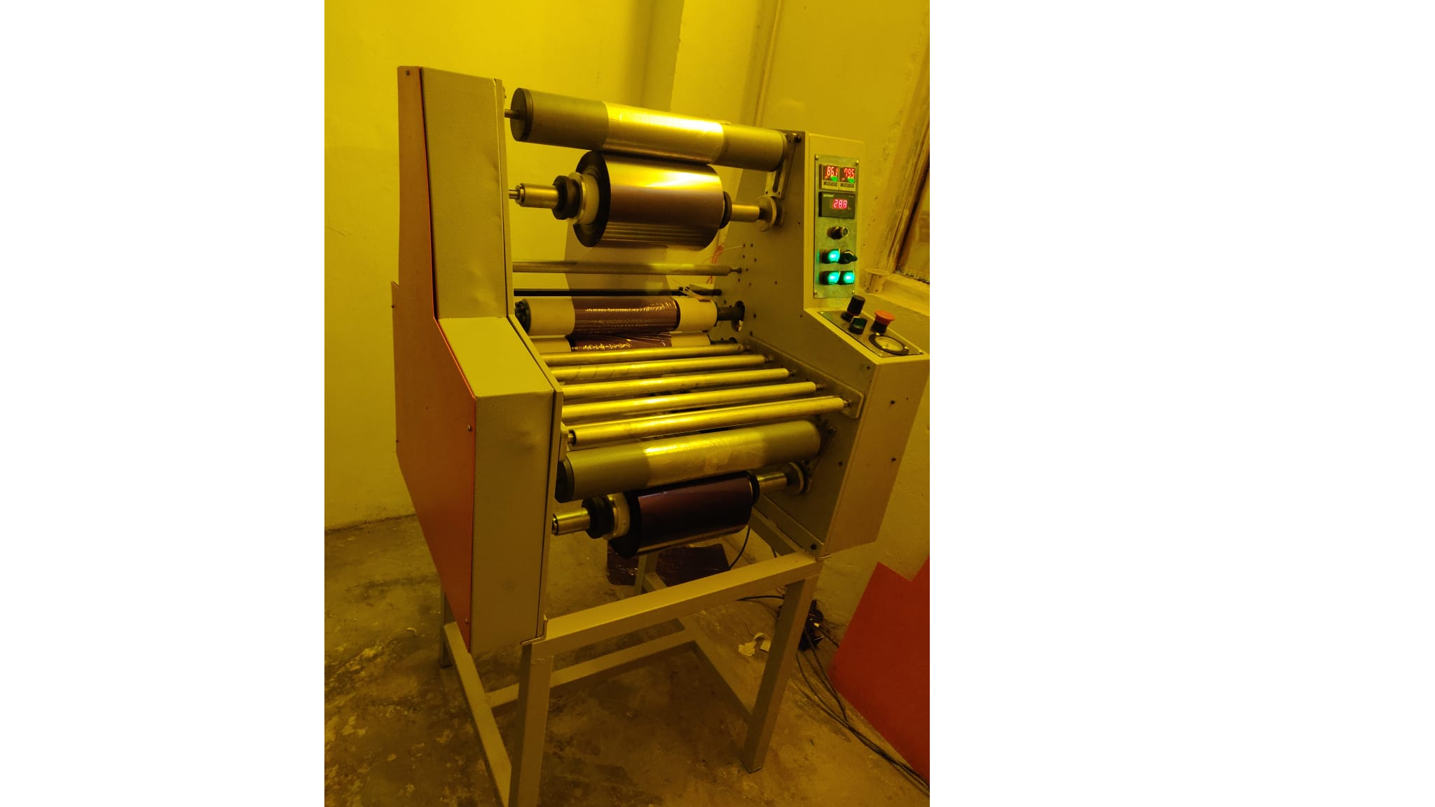 DFR Hot roll laminator Maximum Working Width : - 812 mm Hot Roll Length : - 875 mm Max Panel Thickness : - 2.0 mm Min. Panel Thickness : - 0.5 mm